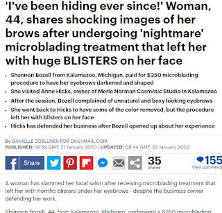 رغبت سيدة أمريكية في الحصول على حاجب مرتب، بعد أن خسرتها بسبب نتفها باستمرار منذ سن العشرين، فأجرت شانون بوزيل، البالغة 44 عامًا، من كالامازو ميشيغان، تقنية مايكروبليدنج مقابل 350 دولارًا، في إحدى مراكز التجميل بعد بحث على الإنترنت.